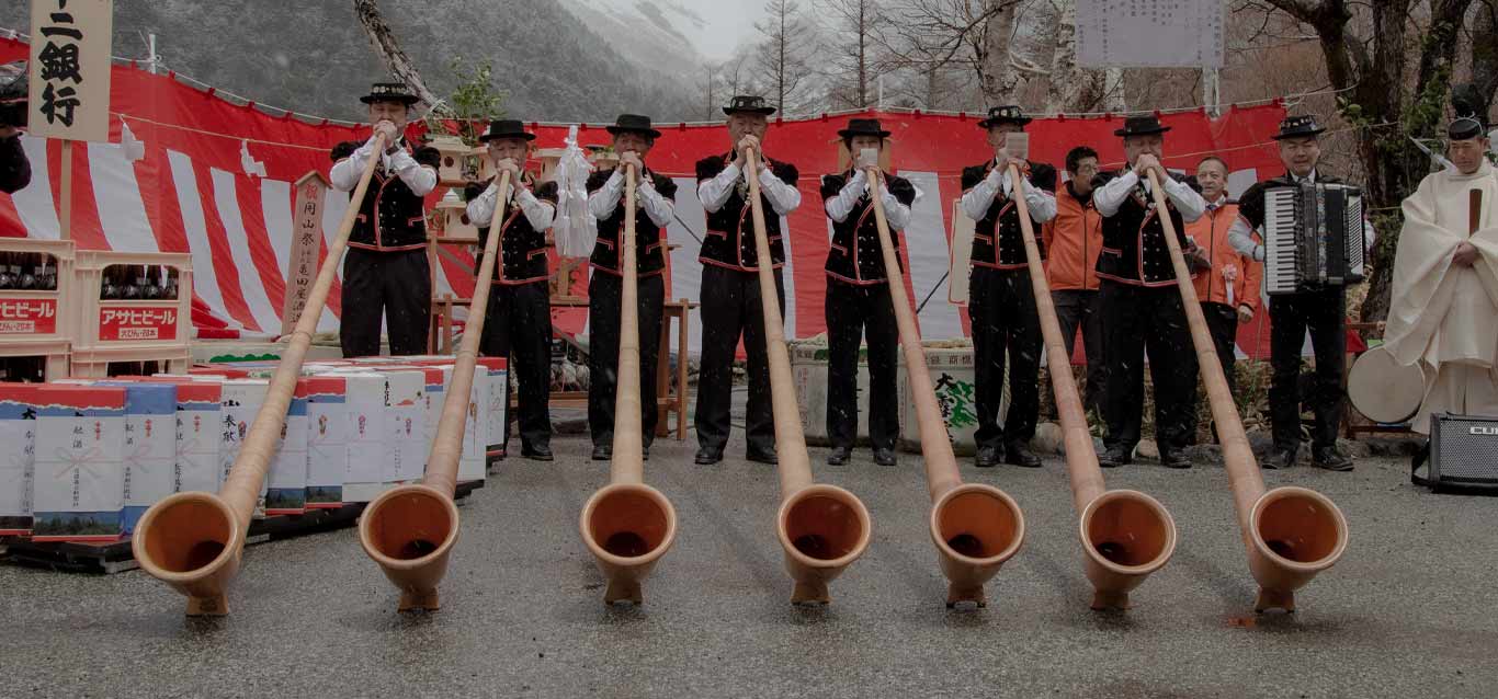 伸びやかでゆったりと響き渡るアルプホルンの音色、ヨーロッパアルプスを連想させるアコーディオンの軽快な曲をオープニングに、穂髙神社の神官によって山の安全と繁栄を祈願する神事が執り行われました。その後、鏡開きや地元保存会による獅子舞の奉納が行われ、上高地は本格的な観光シーズンのスタートを切りました。