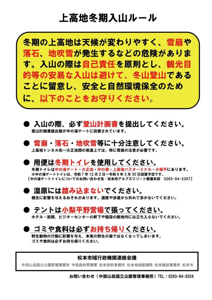 この期間に上高地に入山される方は、自己責任を原則とする冬山登山であることに留意のうえ、以下の事項を必ずお守りください。