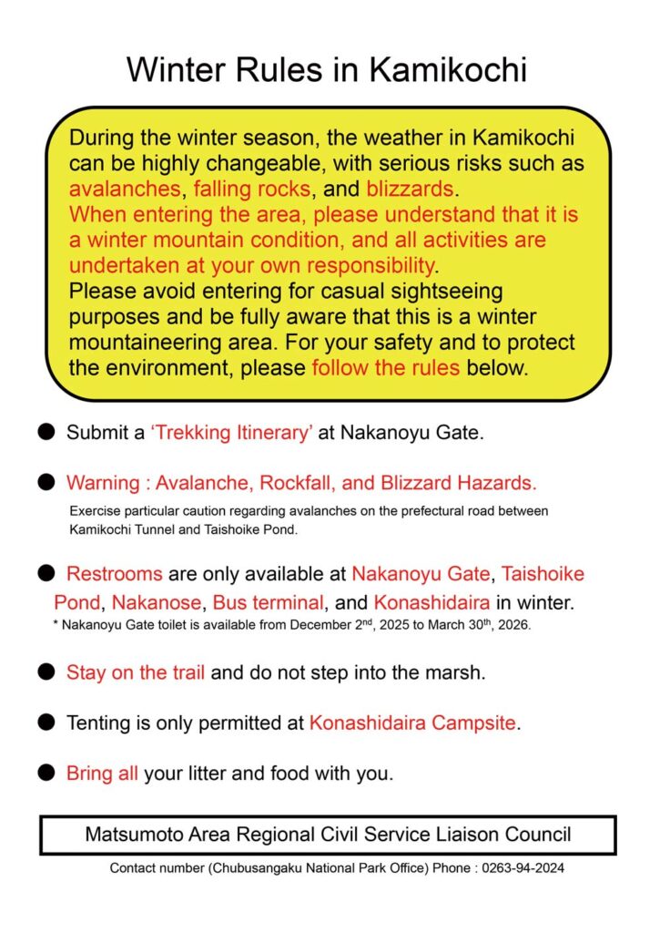 冬季入山をされる方は【上高地冬季入山のルール】をご覧いただき、冬山であることをご理解の上十分注意し、自己責任にて入山をお願いいたします。